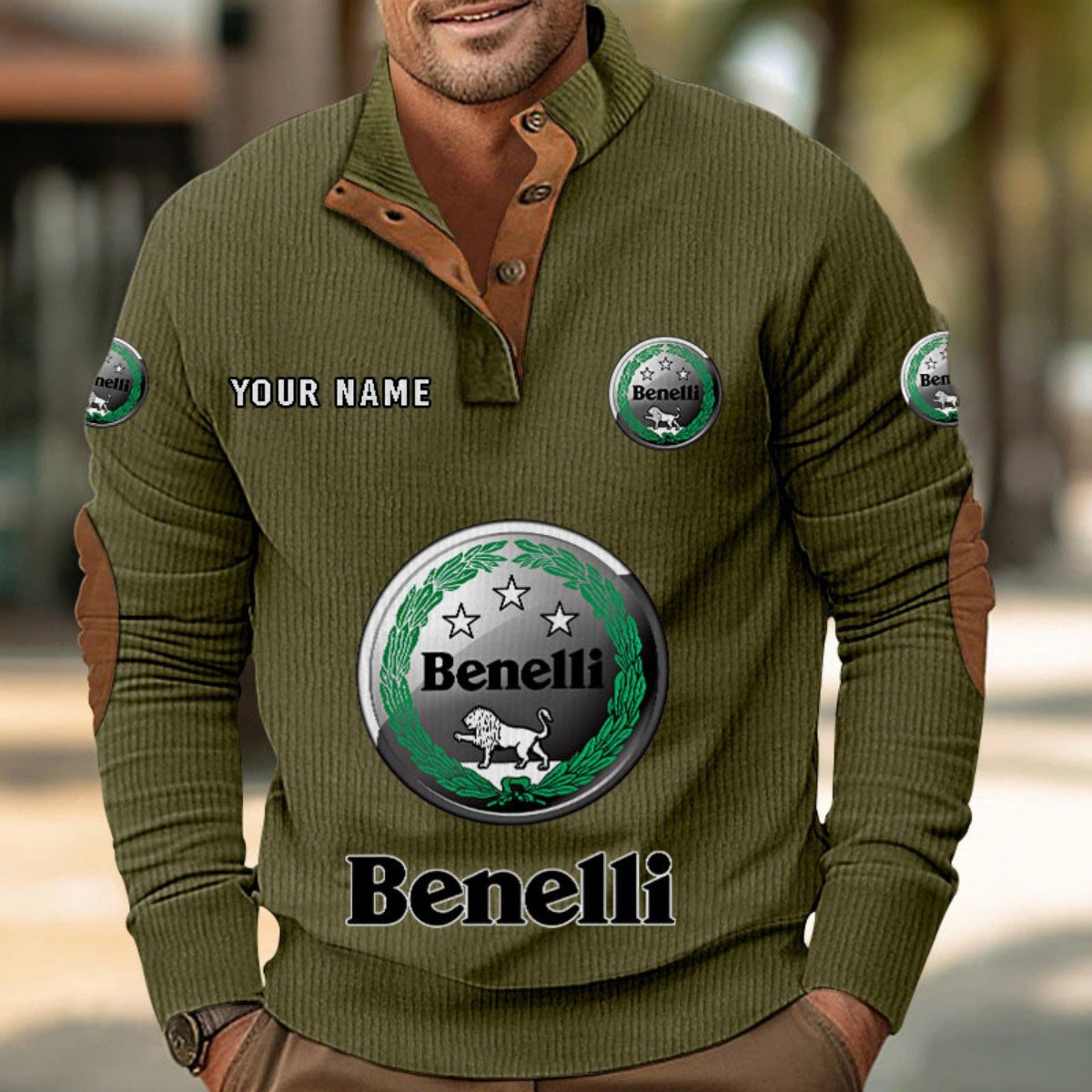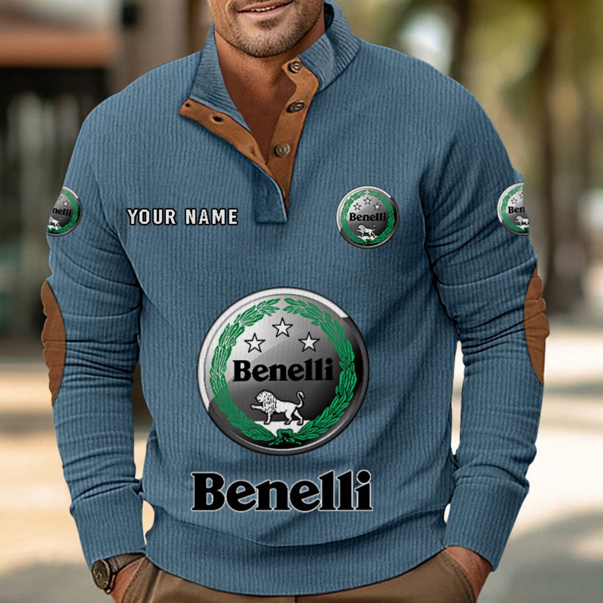 Mit Stehkragen, halber Knopfleiste und stilvollen Details wie Wildleder-Patches an Kragen und Ellbogen bietet er sowohl Komfort als auch Eleganz.