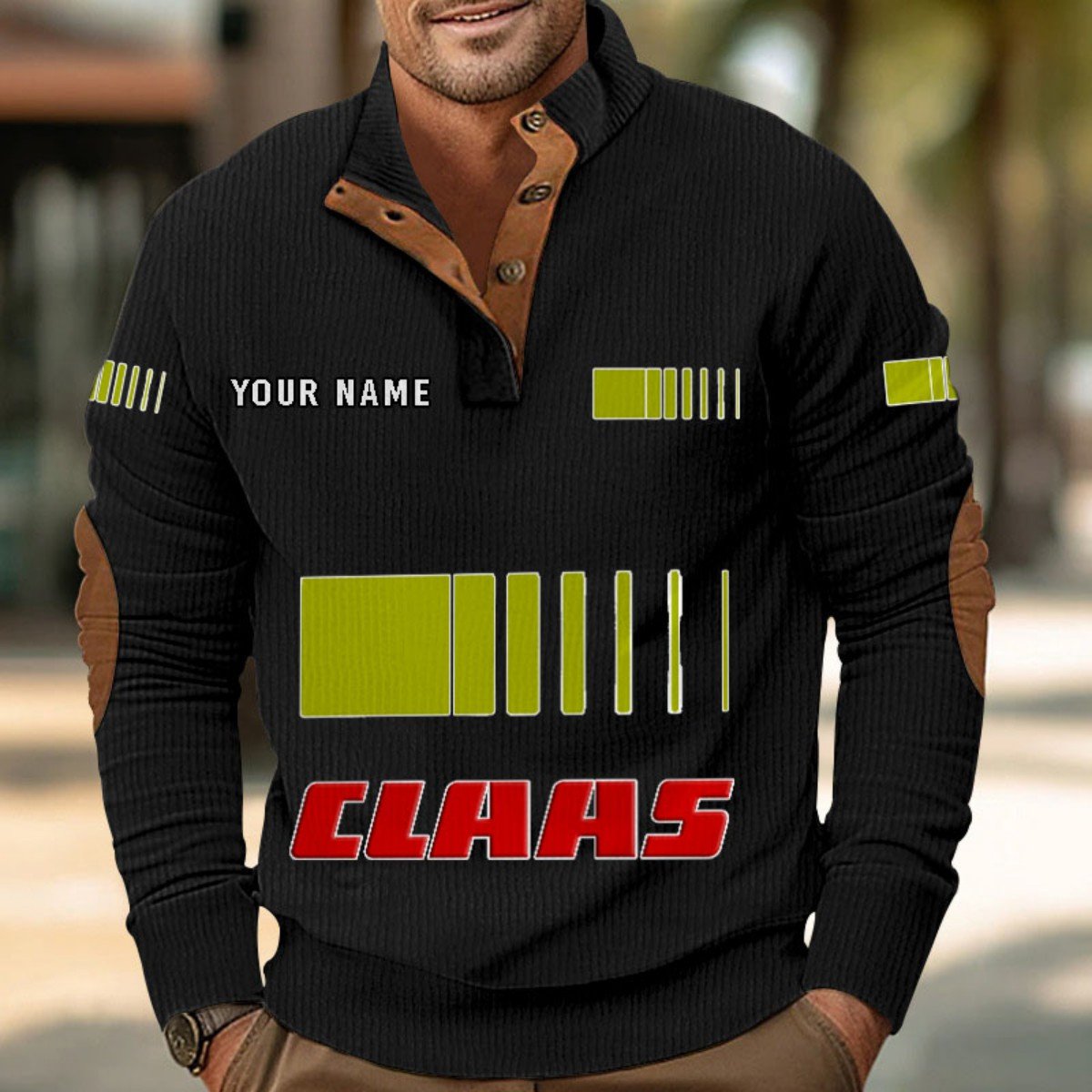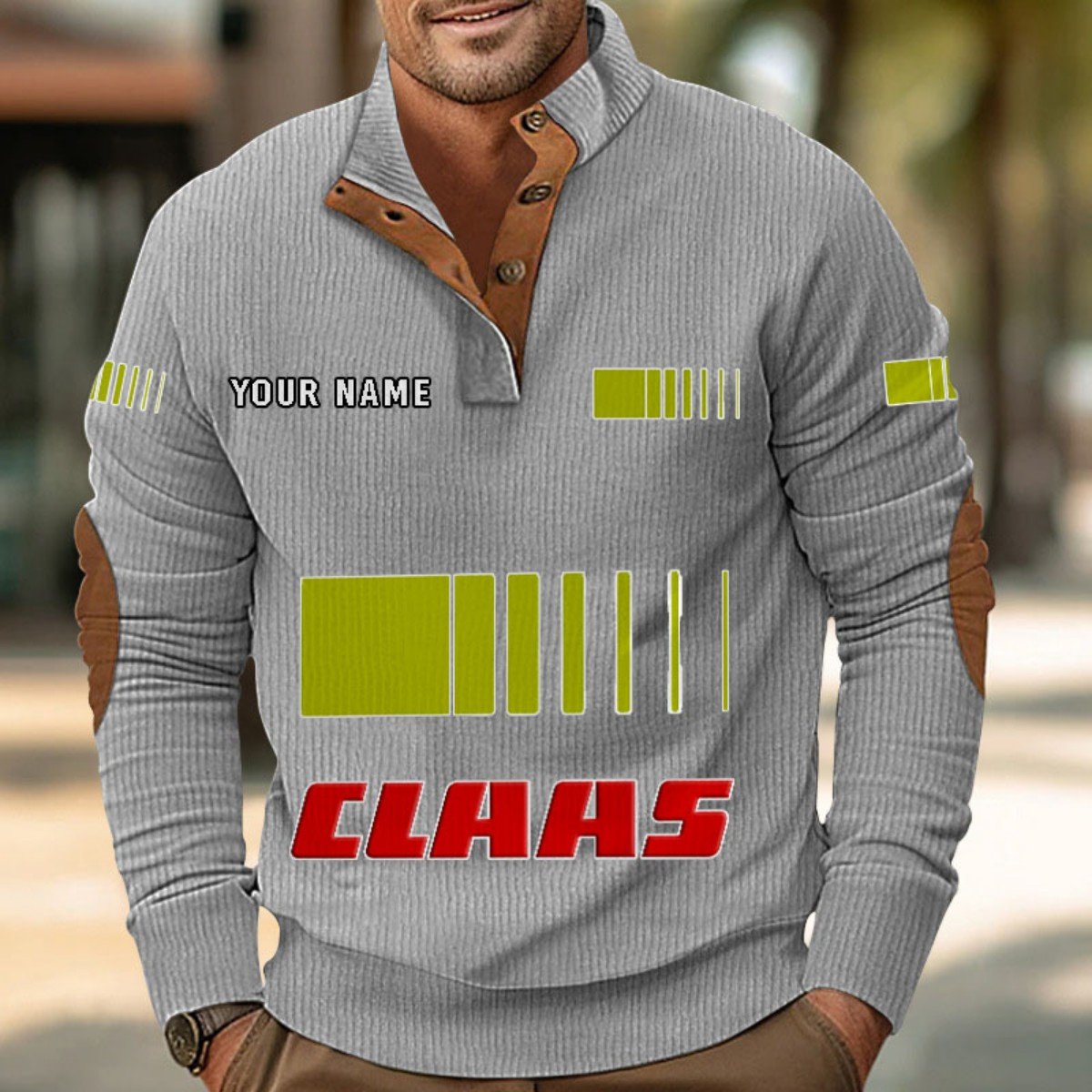 Mit Stehkragen, halber Knopfleiste und stilvollen Details wie Wildleder-Patches an Kragen und Ellbogen bietet er sowohl Komfort als auch Eleganz.