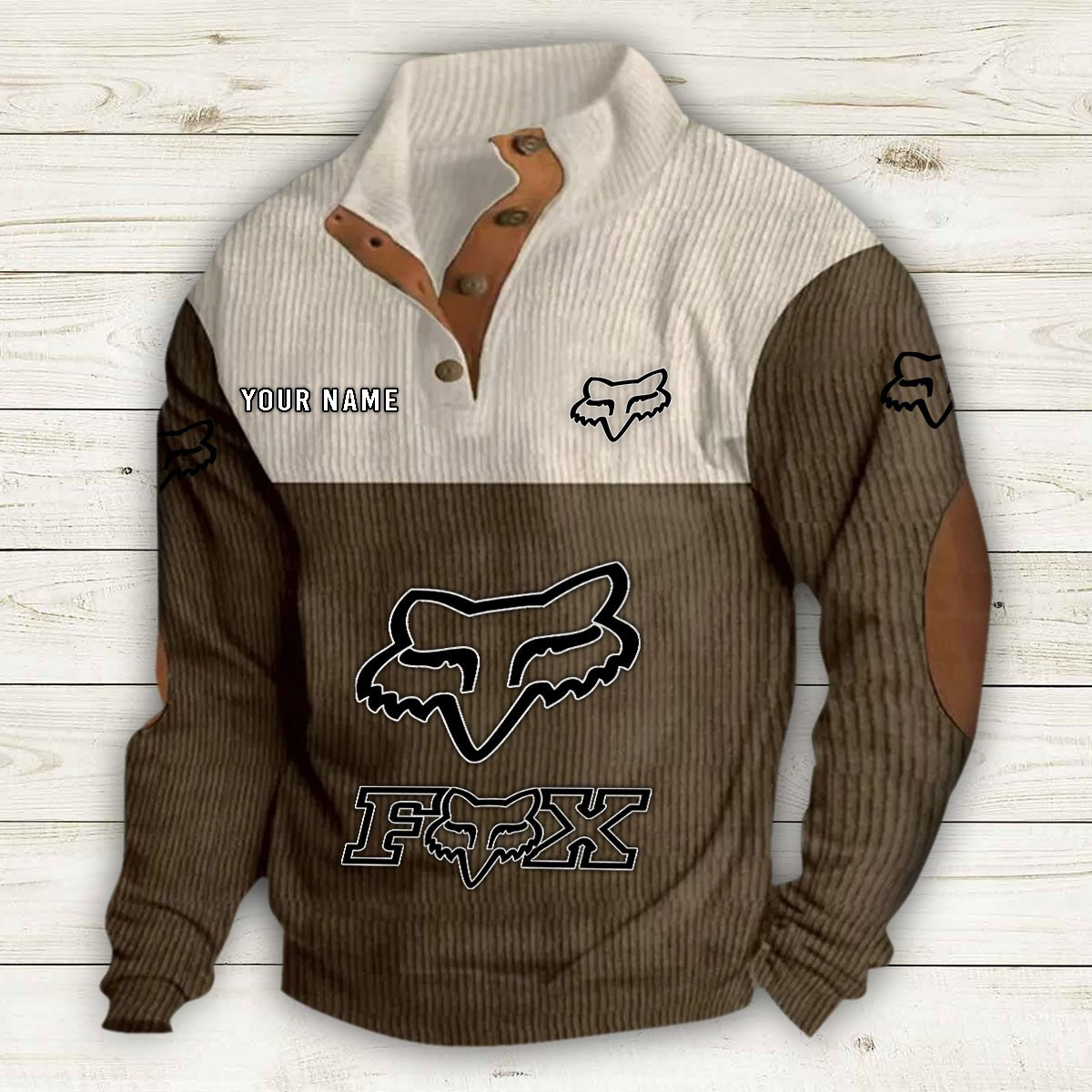 Mit Stehkragen, halber Knopfleiste und stilvollen Details wie Wildleder-Patches an Kragen und Ellbogen bietet er sowohl Komfort als auch Eleganz.