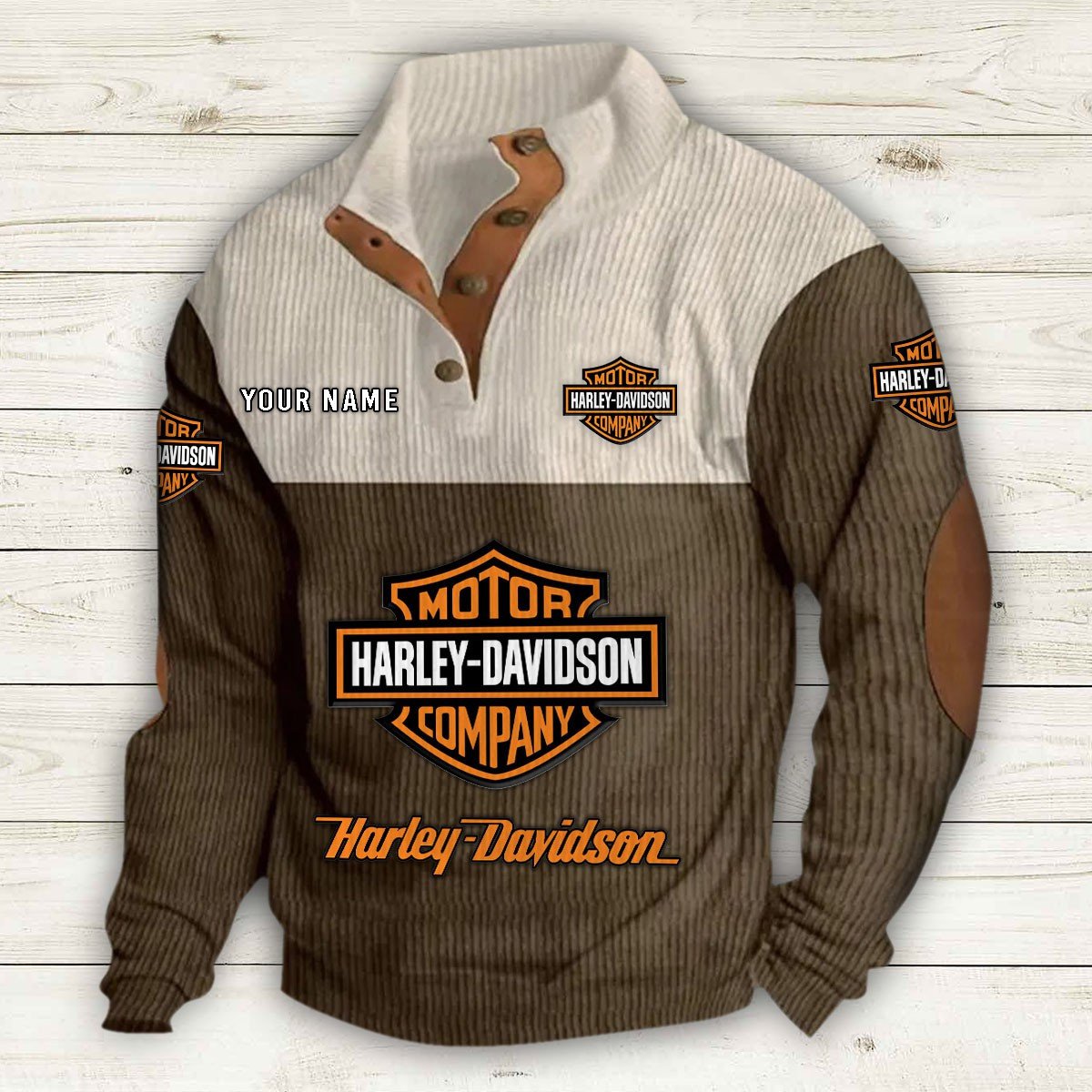 Mit Stehkragen, halber Knopfleiste und stilvollen Details wie Wildleder-Patches an Kragen und Ellbogen bietet er sowohl Komfort als auch Eleganz.
