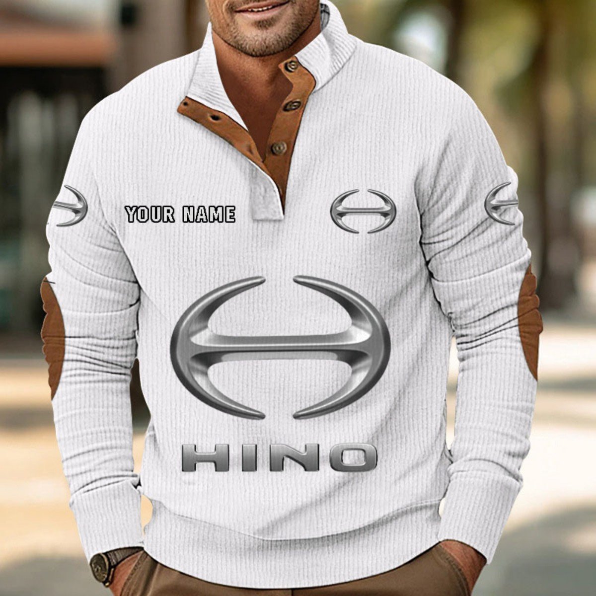 Mit Stehkragen, halber Knopfleiste und stilvollen Details wie Wildleder-Patches an Kragen und Ellbogen bietet er sowohl Komfort als auch Eleganz.