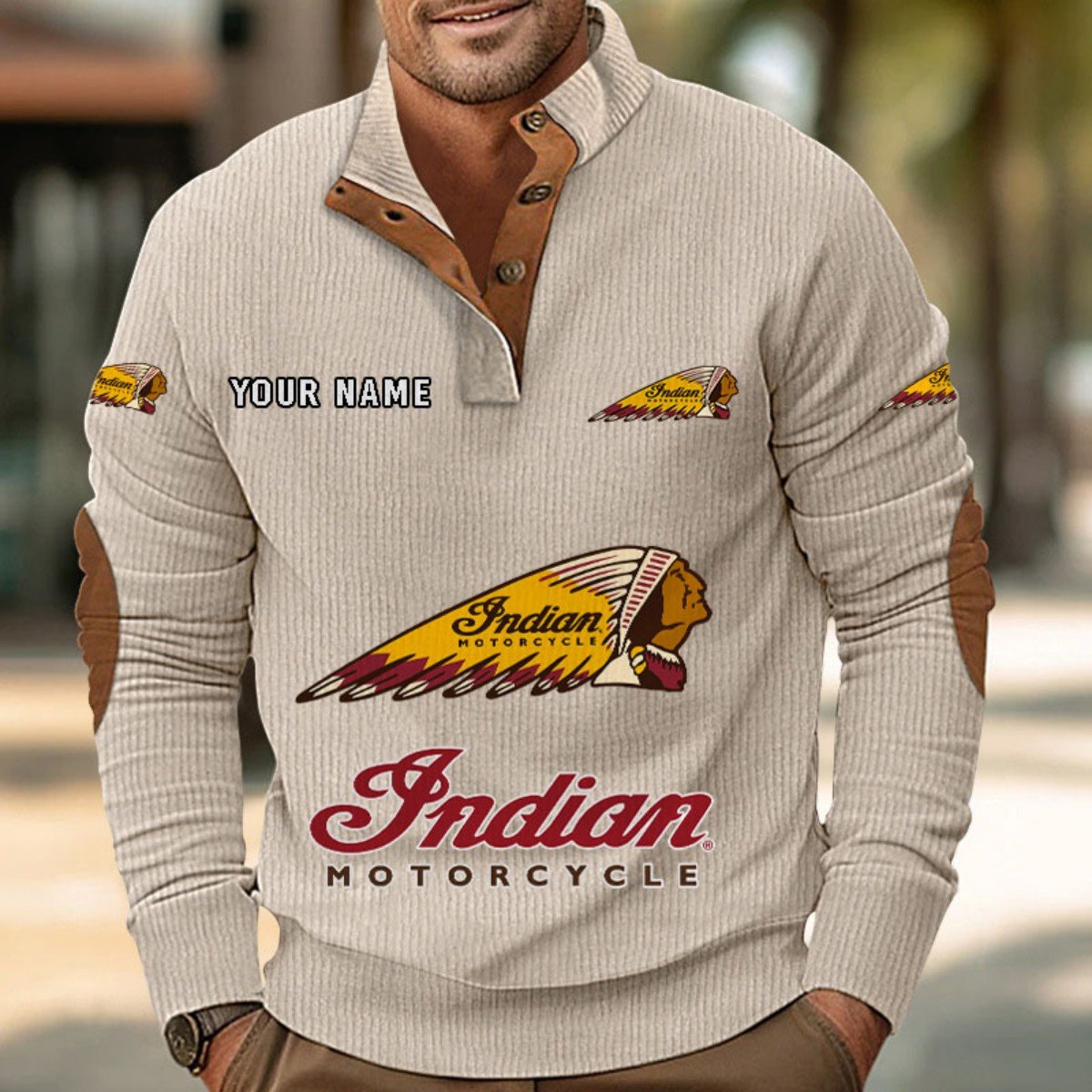 Mit Stehkragen, halber Knopfleiste und stilvollen Details wie Wildleder-Patches an Kragen und Ellbogen bietet er sowohl Komfort als auch Eleganz.