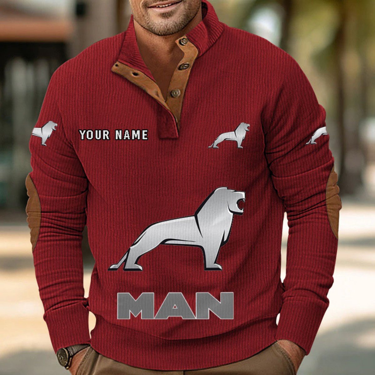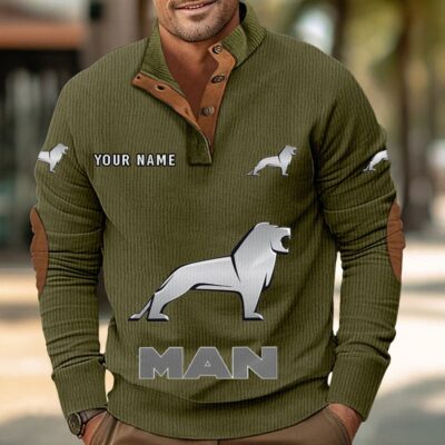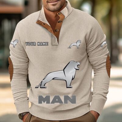 Mit Stehkragen, halber Knopfleiste und stilvollen Details wie Wildleder-Patches an Kragen und Ellbogen bietet er sowohl Komfort als auch Eleganz.