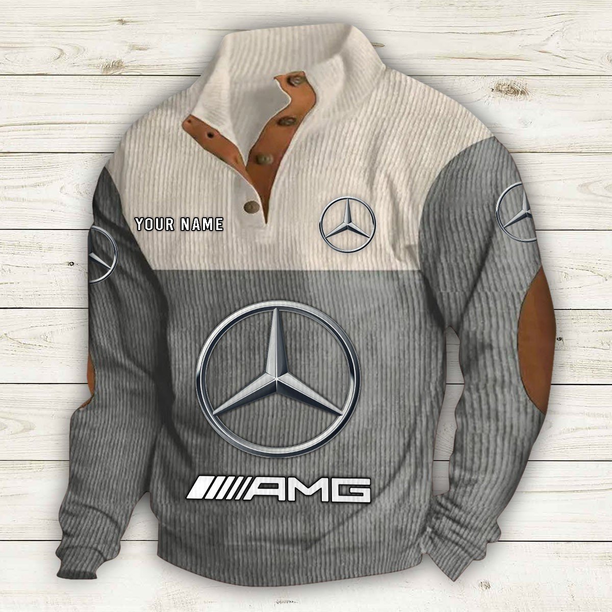 Mit Stehkragen, halber Knopfleiste und stilvollen Details wie Wildleder-Patches an Kragen und Ellbogen bietet er sowohl Komfort als auch Eleganz.