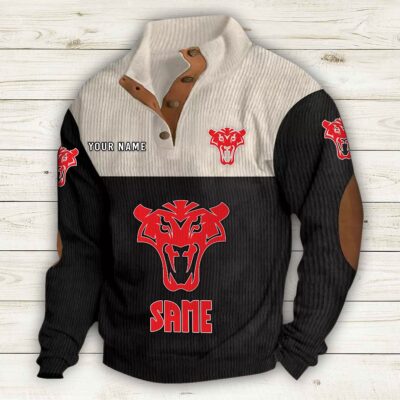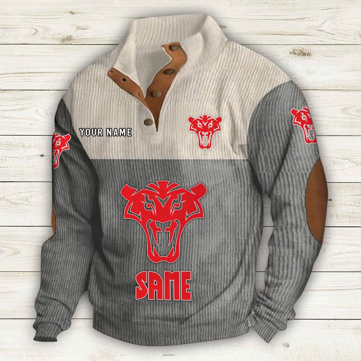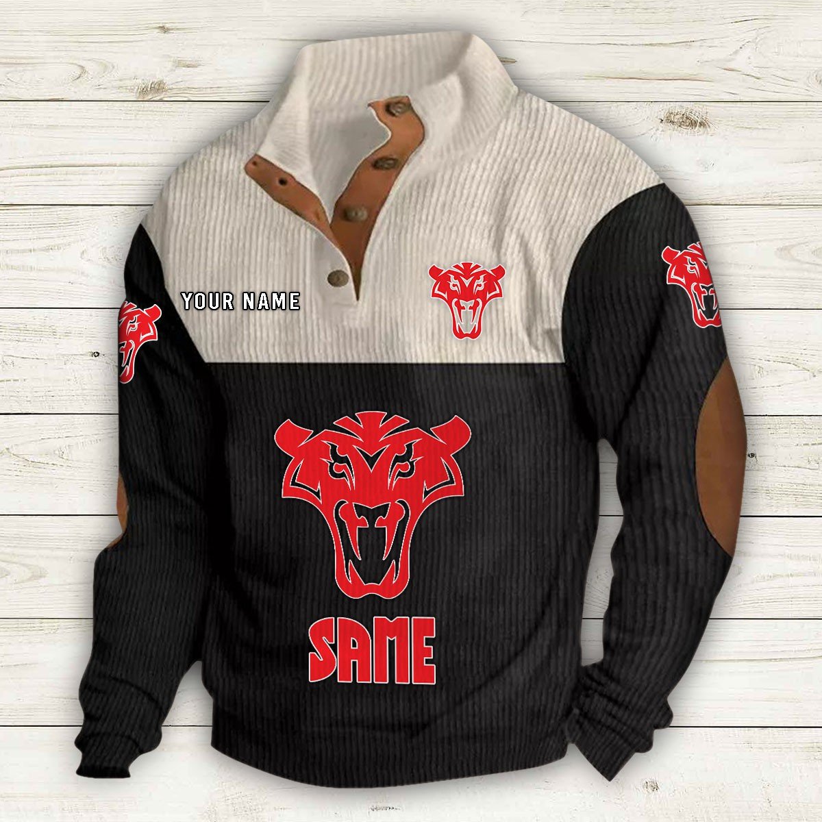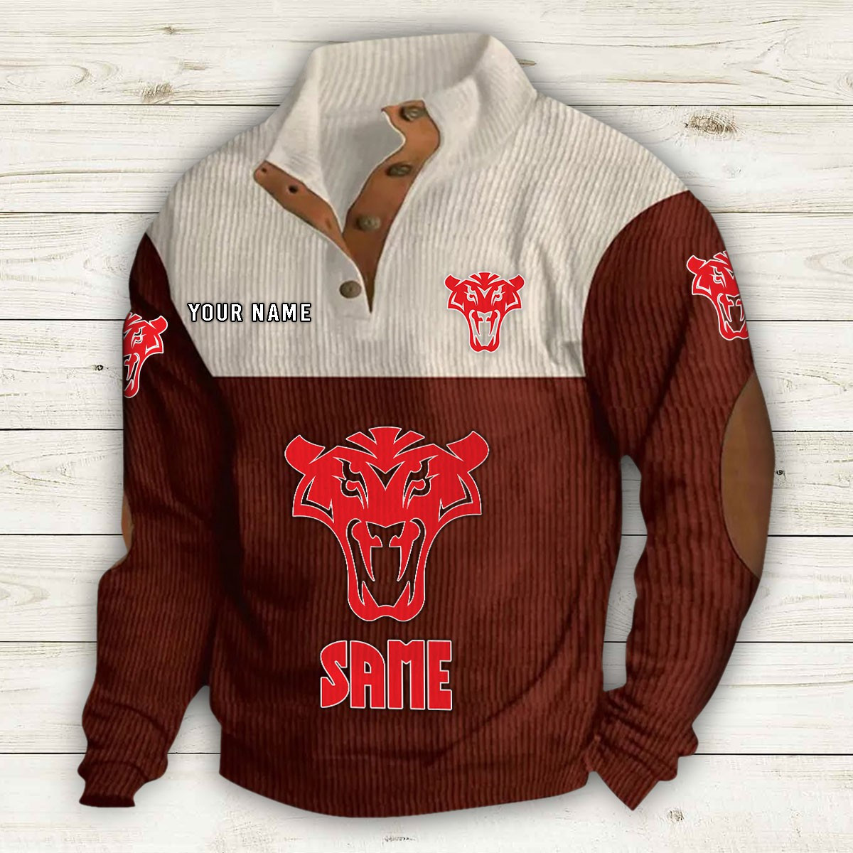 Mit Stehkragen, halber Knopfleiste und stilvollen Details wie Wildleder-Patches an Kragen und Ellbogen bietet er sowohl Komfort als auch Eleganz.