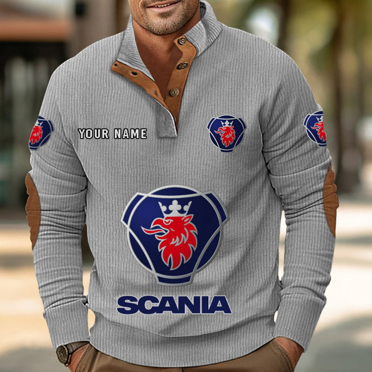 Mit Stehkragen, halber Knopfleiste und stilvollen Details wie Wildleder-Patches an Kragen und Ellbogen bietet er sowohl Komfort als auch Eleganz.