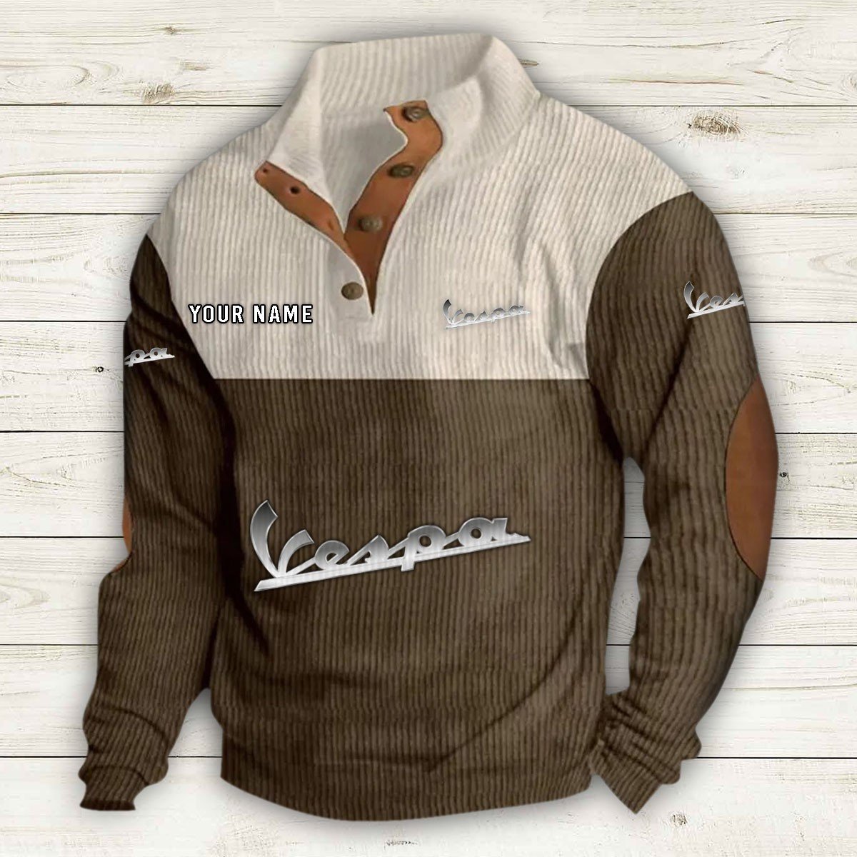 Mit Stehkragen, halber Knopfleiste und stilvollen Details wie Wildleder-Patches an Kragen und Ellbogen bietet er sowohl Komfort als auch Eleganz.