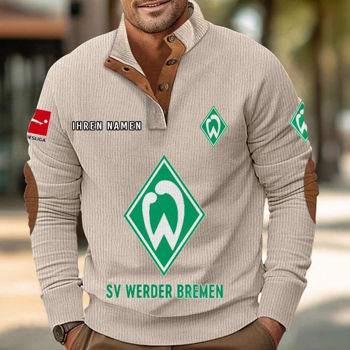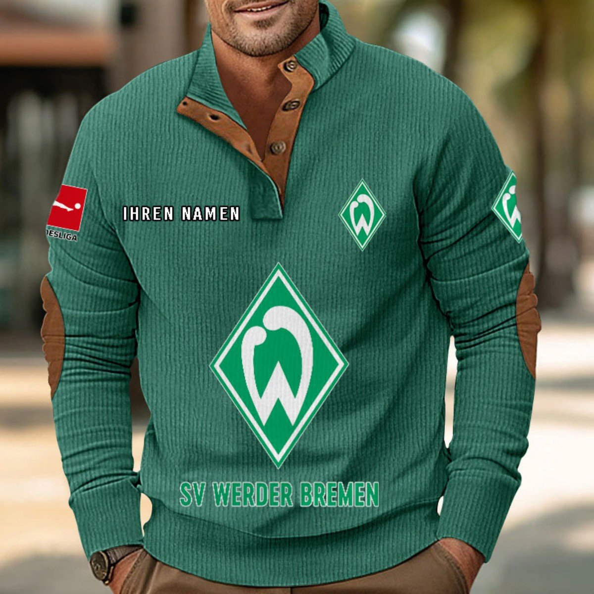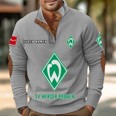 Mit Stehkragen, halber Knopfleiste und stilvollen Details wie Wildleder-Patches an Kragen und Ellbogen bietet er sowohl Komfort als auch Eleganz.
