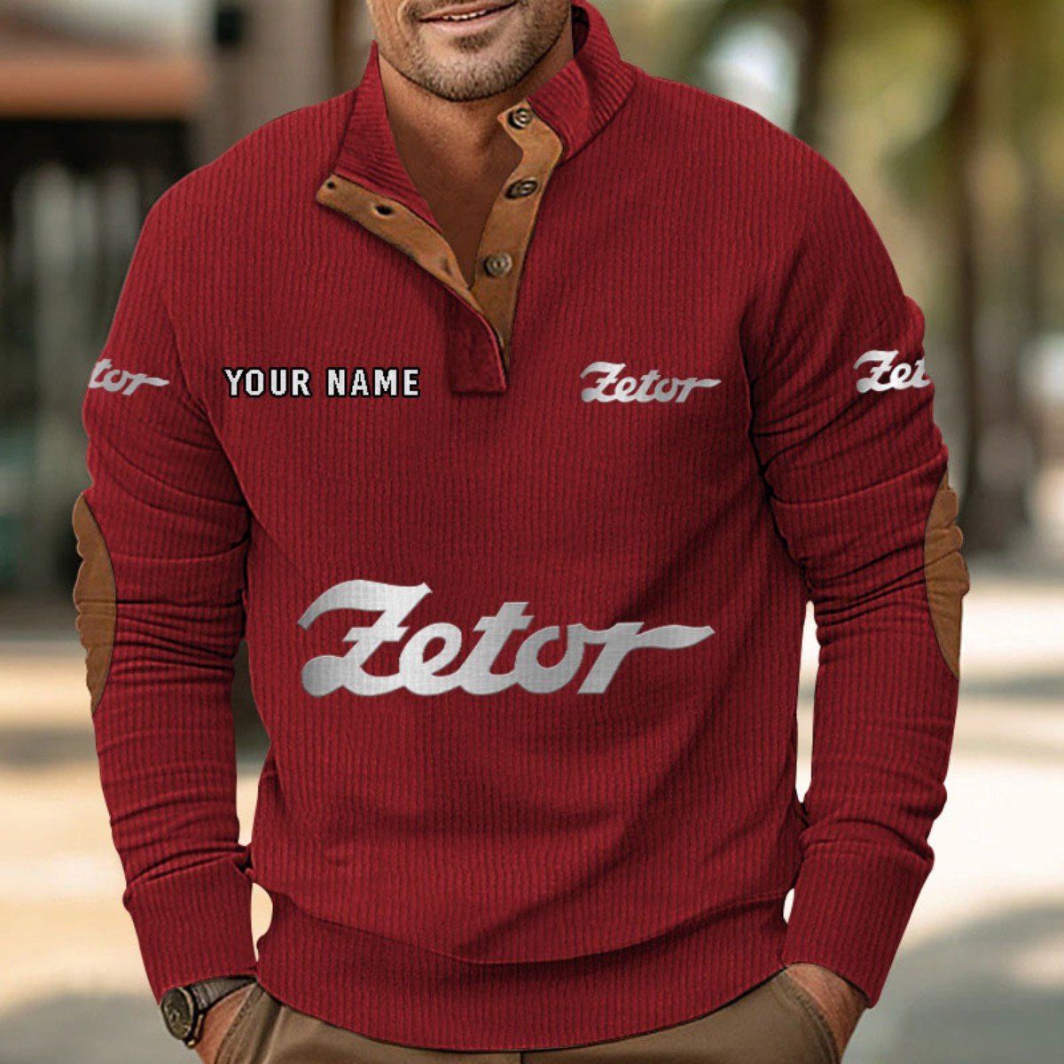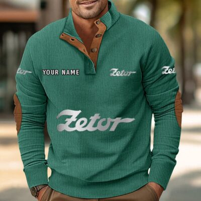 Mit Stehkragen, halber Knopfleiste und stilvollen Details wie Wildleder-Patches an Kragen und Ellbogen bietet er sowohl Komfort als auch Eleganz.