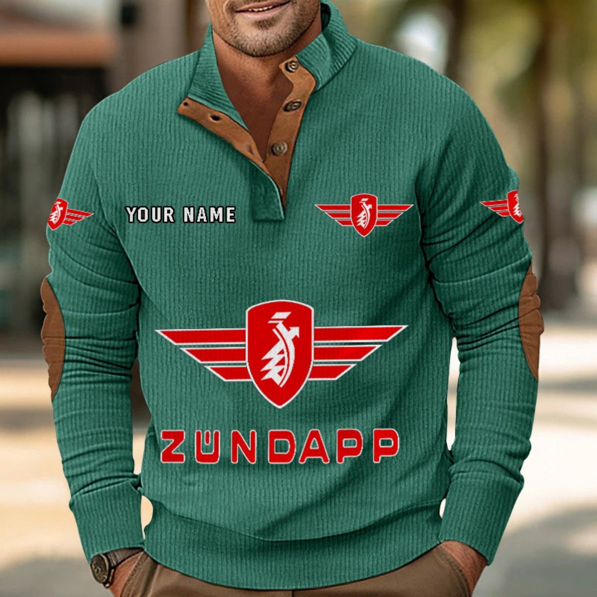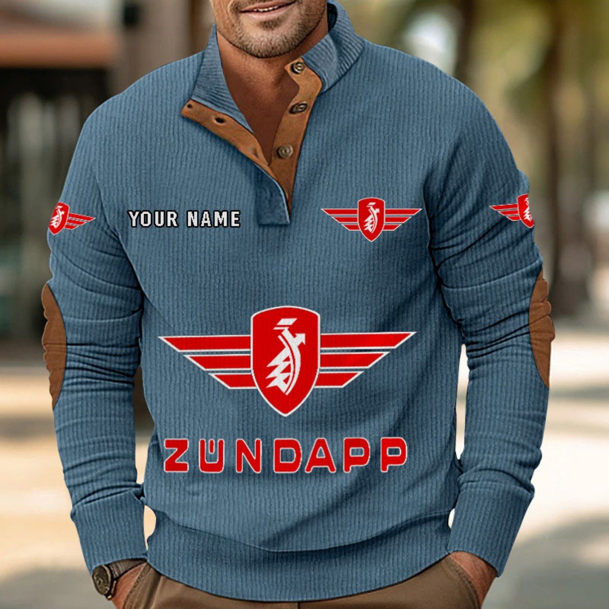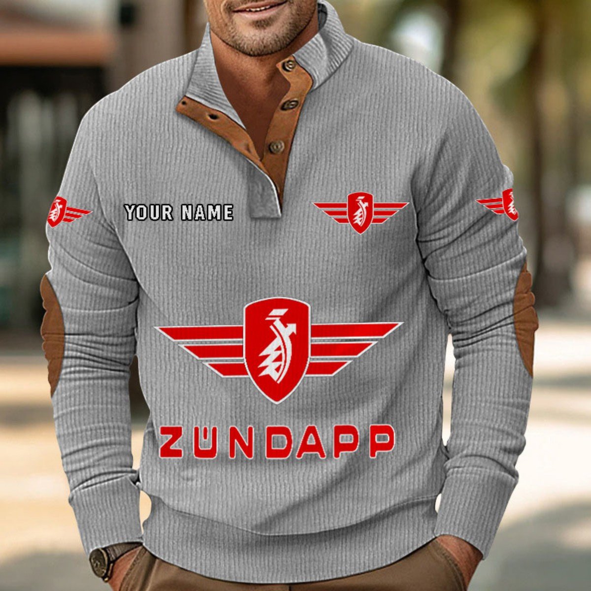 Mit Stehkragen, halber Knopfleiste und stilvollen Details wie Wildleder-Patches an Kragen und Ellbogen bietet er sowohl Komfort als auch Eleganz.